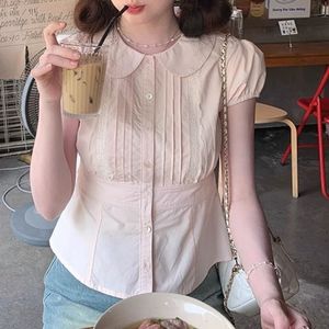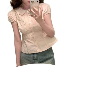 韩系温柔风粉色娃娃领收腰短袖衬衫女夏季设计感减龄蕾丝花边衬衣