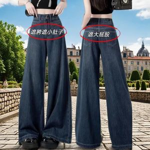 大码胖mm复古蓝直筒牛仔裤女秋冬加绒高腰遮胯垂感梨形身材阔腿裤