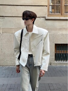 cleanfit白色短款皮衣外套男潮高级感痞帅飞行员皮夹克垫肩机车服