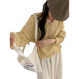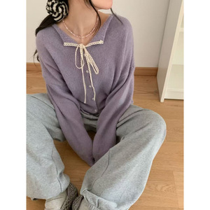 KANING韩系系带蕾丝翻领毛衣小外套女秋新款纯色百搭软糯针织开衫