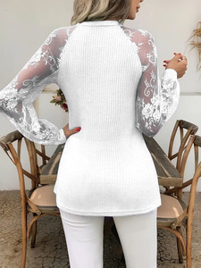 2025欧美跨境亚马逊秋冬新款女装V领长袖拼接蕾丝时尚T恤女上衣