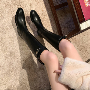 葡萄妈秋冬新款尖头小粗跟骑士靴中高筒长靴女