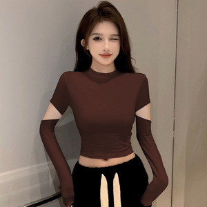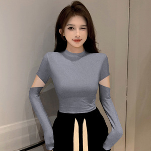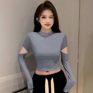 螺纹黑色半高领打底衫女春秋内搭针织短款长袖t恤破洞紧身上衣潮
