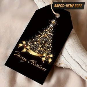 48件圣诞礼物标签配麻绳 -奢华金色圣诞树设计圣诞卡片礼品包装卡