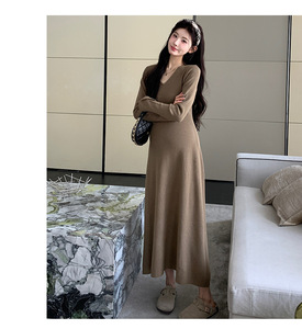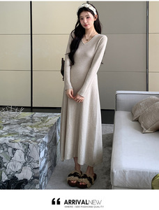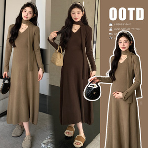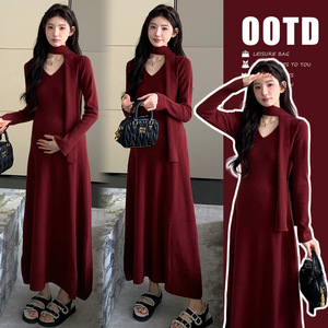 孕妇连衣裙2025秋冬新款优雅V领高级感辣妈带围脖显瘦打底针织裙