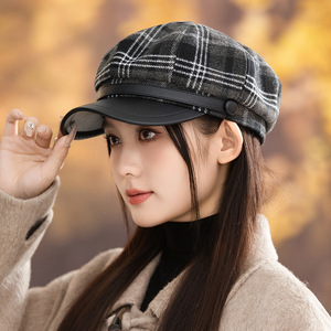 英伦风文艺复古格纹八角帽秋冬季帽子女款韩版时尚百搭鸭舌贝雷帽