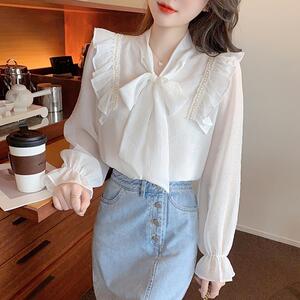 法式蝴蝶结系带雪纺衫女2025年春季新款洋气百搭荷叶边打底衫上衣