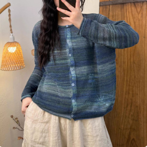 2025秋季新款休闲百搭水墨彩系扣休闲文艺圆领渐变针织上衣 女