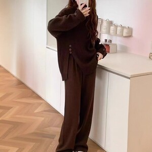 秋冬针织衫套装女2025新款圆领纯色上衣开叉针织衫毛衣裤子两件套