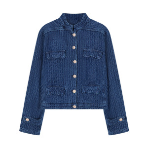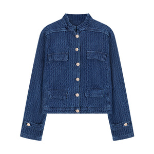 跨境牛仔小香风外套女装秋季宽松小众肌理感立领蓝色夹克百搭气质