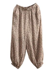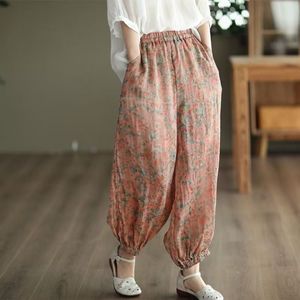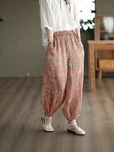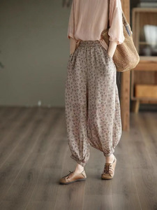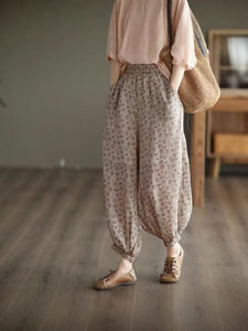 复古文艺印花休闲麻裤女新款高腰显瘦细苎麻灯笼裤碎花哈伦裤女潮
