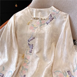 新中式国风刺绣唐装衬衫女2025新款早秋大码胖mm遮肚缎面小衫上衣