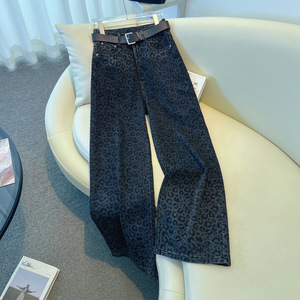 黑灰色窄版牛仔阔腿裤女2025秋季新款豹纹美式高腰宽松拖地直筒裤