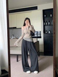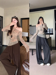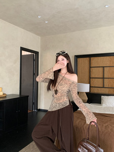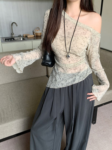 大码女装秋季斜肩木耳花边袖口下摆设计网纱高级感上衣T恤