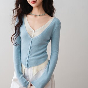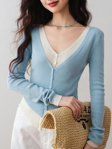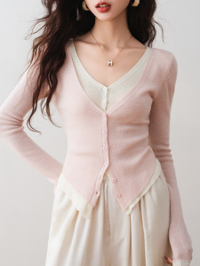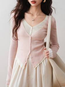 ron&ron韩系假两件撞色针织开衫2025早春新款气质修身收腰v领上T