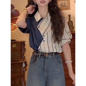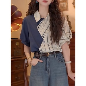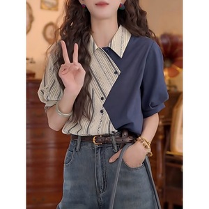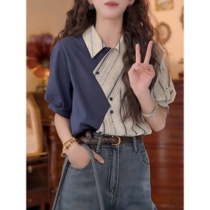 设计感不规则拼接条纹翻领短袖衬衫女夏季2025新款复古港风上衣潮