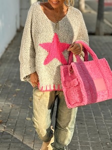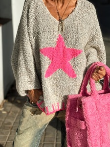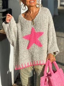 2025秋季新款跨境外贸星星图案女式毛衣休闲宽松圈圈纱V领针织衫