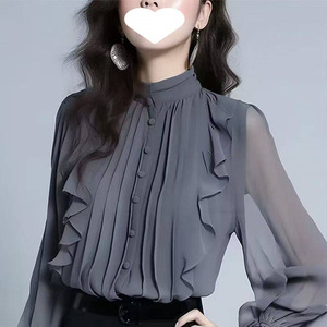 高端雪纺立领衬衫女春秋季新款时尚高级感荷叶边法式长袖小衫上衣