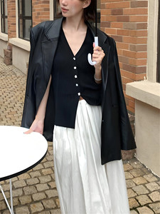 2025年新款秋季复古黑色西装领皮衣外套女中长款宽松显瘦PU皮上衣