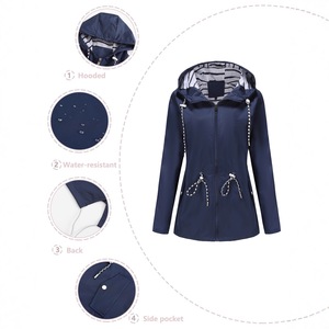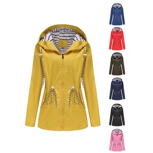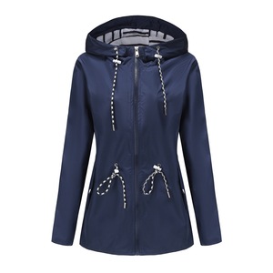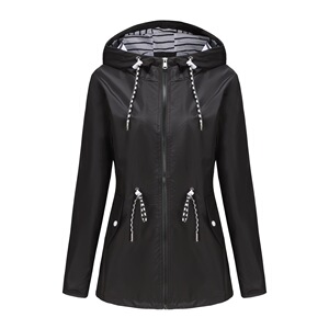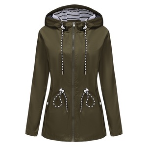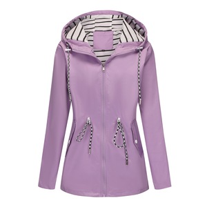 2025欧美新款长袖防泼水中长款风衣女连帽雨衣跨境大码女装里条纹