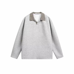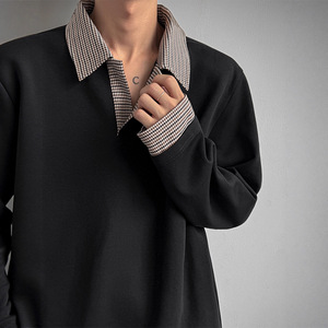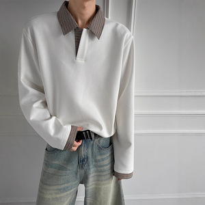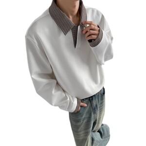 美式千鸟格拼接白色卫衣男秋季老钱风穿搭长袖POLO衫重磅翻领T恤
