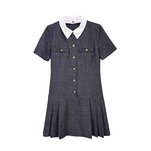 早秋2025女装复古英伦灰色格纹可拆卸领钻饰重工烫钻百褶连衣裙