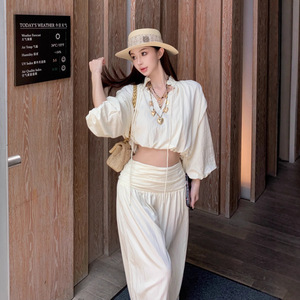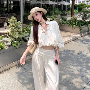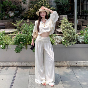 RHGD实拍 优雅套装女手工压褶V领荷叶边长袖上衣气质宽腰头休闲裤