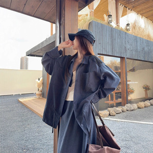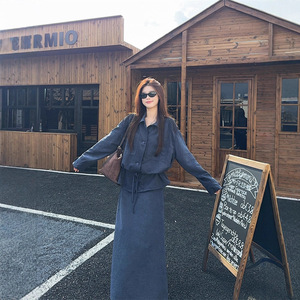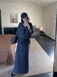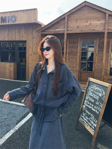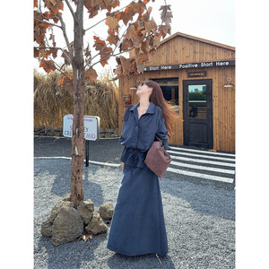 实拍 韩系重工抽绳衬衫长袖百搭上衣套装女秋休闲半身长裙两件套