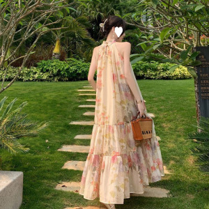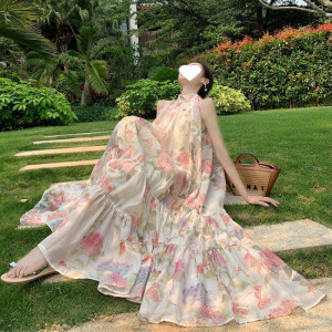 大码茶歇法式气质挂脖连衣裙海边度假风温柔超仙森系碎花长裙夏季
