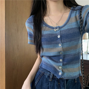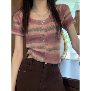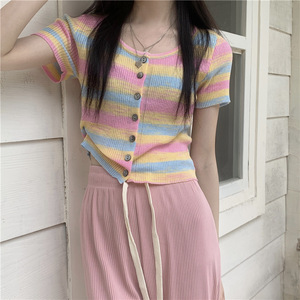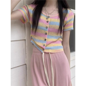 彩色条纹短袖针织衫女T恤夏季新款甜辣妹短款开衫单排扣减龄上衣