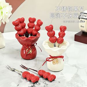 创意花束爱心水果叉陶瓷收纳筒桌面装饰摆件高颜值不锈钢果叉套装