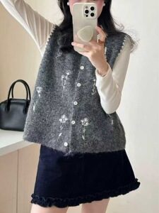 秋冬款拼色针织马甲女刺绣小清新无袖毛线衣内搭叠穿坎肩背心上衣