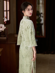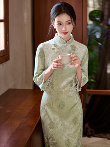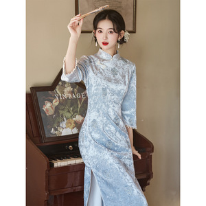 复古改良旗袍2025新款秋季长袖丝绒高级感青色绝美日常可穿连衣裙