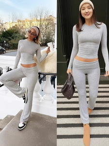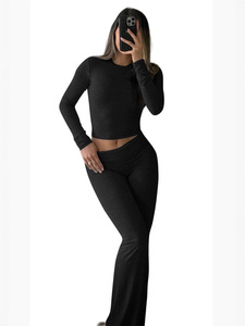外贸休闲锻炼女式两件套圆领长袖低腰喇叭裤运动服套装批发俩件套