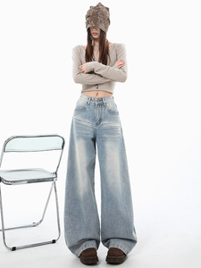 美式宽松复古做旧刺绣牛仔裤女2025年秋季新款高腰直筒百搭阔腿裤