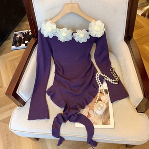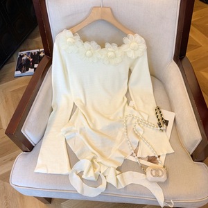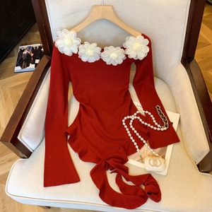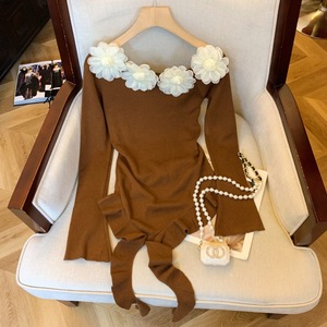 纯欲立体花朵斜领长袖针织衫女不规则上衣秋