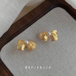 中古风蝴蝶结镀真金蚊香盘耳夹复古甜美肌理感百搭珍珠无耳洞耳饰