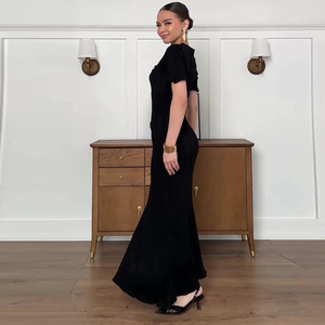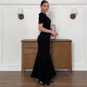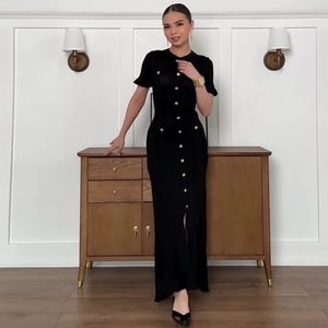 2025年新款欧美亚马逊跨境外贸女装单排扣短袖修身开叉黑色连衣裙