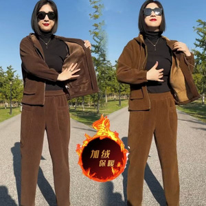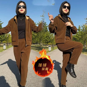 秋冬新款妈妈装保暖加绒套装中老年哈伦洋气连帽宽松休闲时尚运动