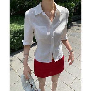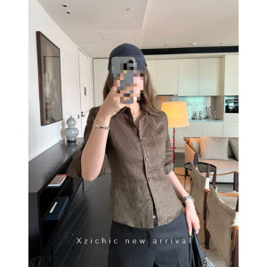包好看的棉麻中袖衬衫女2025夏季新款天然褶皱衬衣收腰上衣象牙白