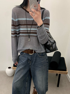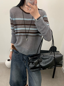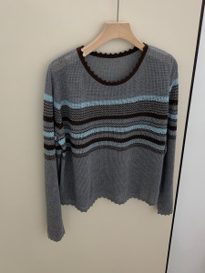 独特别致针织衫女2025新款韩系穿搭薄款长袖t恤条纹镂空上衣罩衫