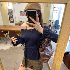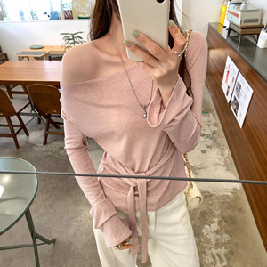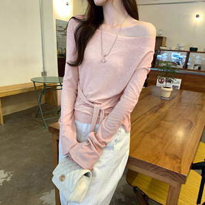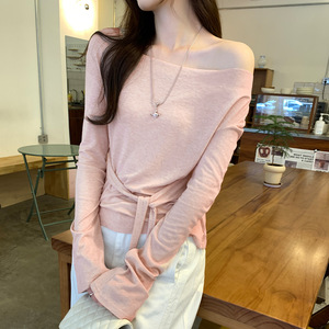 粉色温柔气质长袖斜肩t恤女装潮2025早秋款天丝羊毛绑带荡领上衣