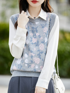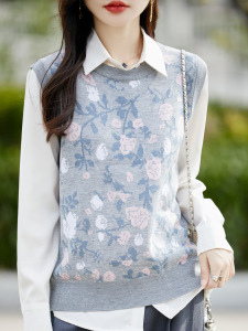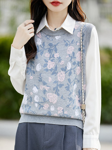 2025新中式复古提花羊毛马甲女宽松灰色国风羊毛针织背心坎肩外套