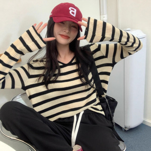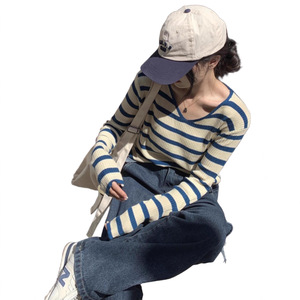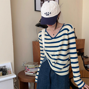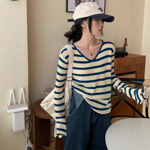 坑条撞色复古法式V领长袖T恤宽松2025秋季穿搭洋气别致内搭打底衫