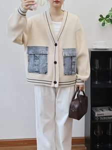 2025秋冬新款韩版宽松拼接牛仔口袋针织双面呢开衫休闲毛衣外套女
