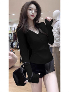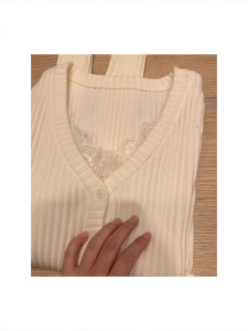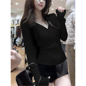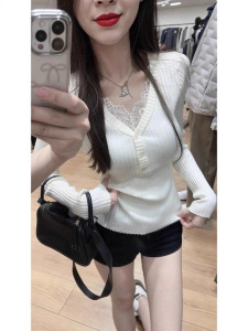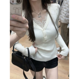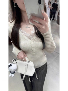 新款蕾丝拼接假两件毛衣女秋冬高级感法式v领内搭针织打底长袖上