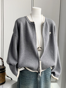 早秋宽松双拉链短款外穿针织开衫女春秋新款纯色字母刺绣毛衣外套