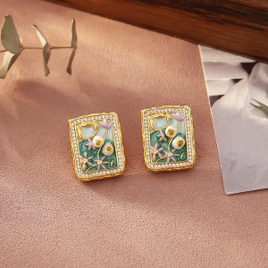 墨绿色滴油淡水珍珠锆石耳钉(加厚真金电镀)