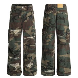 世阔Z013美式嘻哈破洞补丁多口袋迷彩工装裤男女潮宽松休闲直筒裤