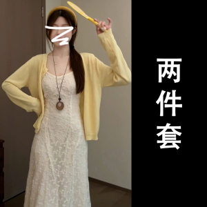 黄色开衫+杏色连衣裙【套装】【韩系流行单品穿搭一整套/感超好看漂亮/减龄时尚/今年流行chic小个子